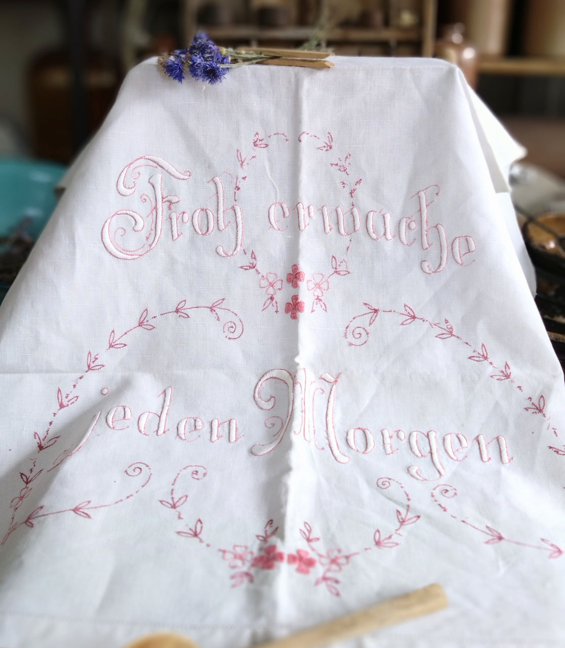 Dieses alte Sticktuch ist echte Handarbeit. Altes Leinen cremeweiß/rot handbestickt. Sehr alt. Super Zustand. 108 x 56 cm